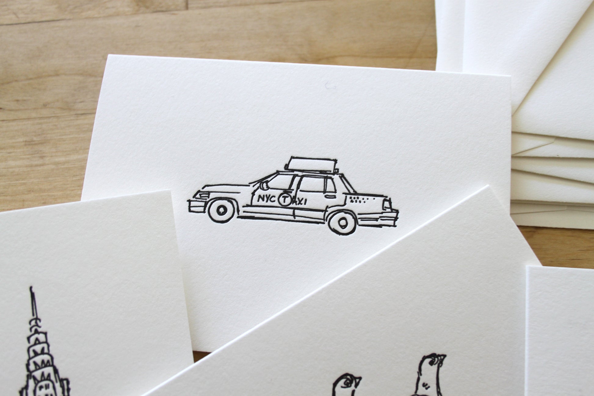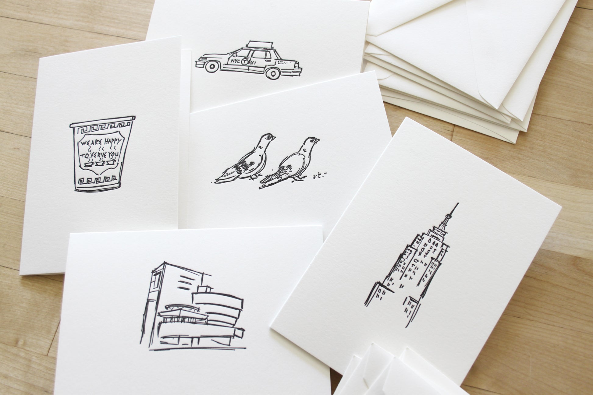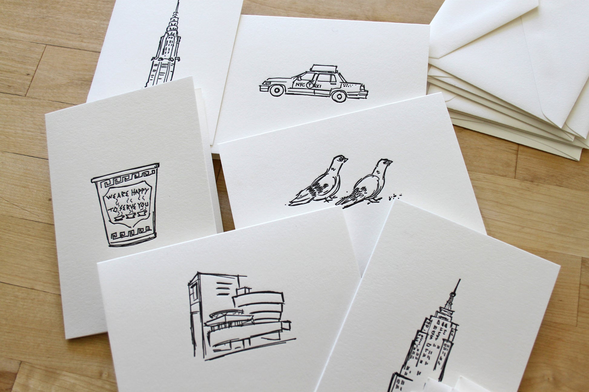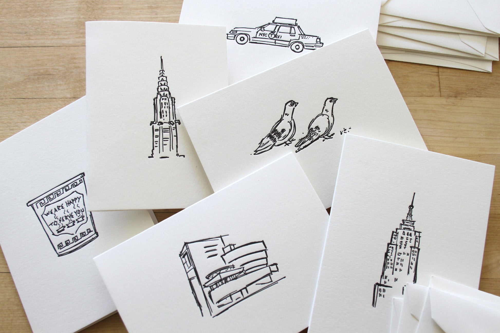 Six Letterpress FOLDED Notecards. Bring a touch of New York charm to your handwritten notes. This six-card notecard set features original illustrations by artist Matthew Nixon, printed by hand on our antique letterpress. Each design highlights the city’s most beloved icons: the Empire State Building, Chrysler Building, Guggenheim, a pair of pigeons, the classic Greek coffee cup, and the iconic NYC taxi.