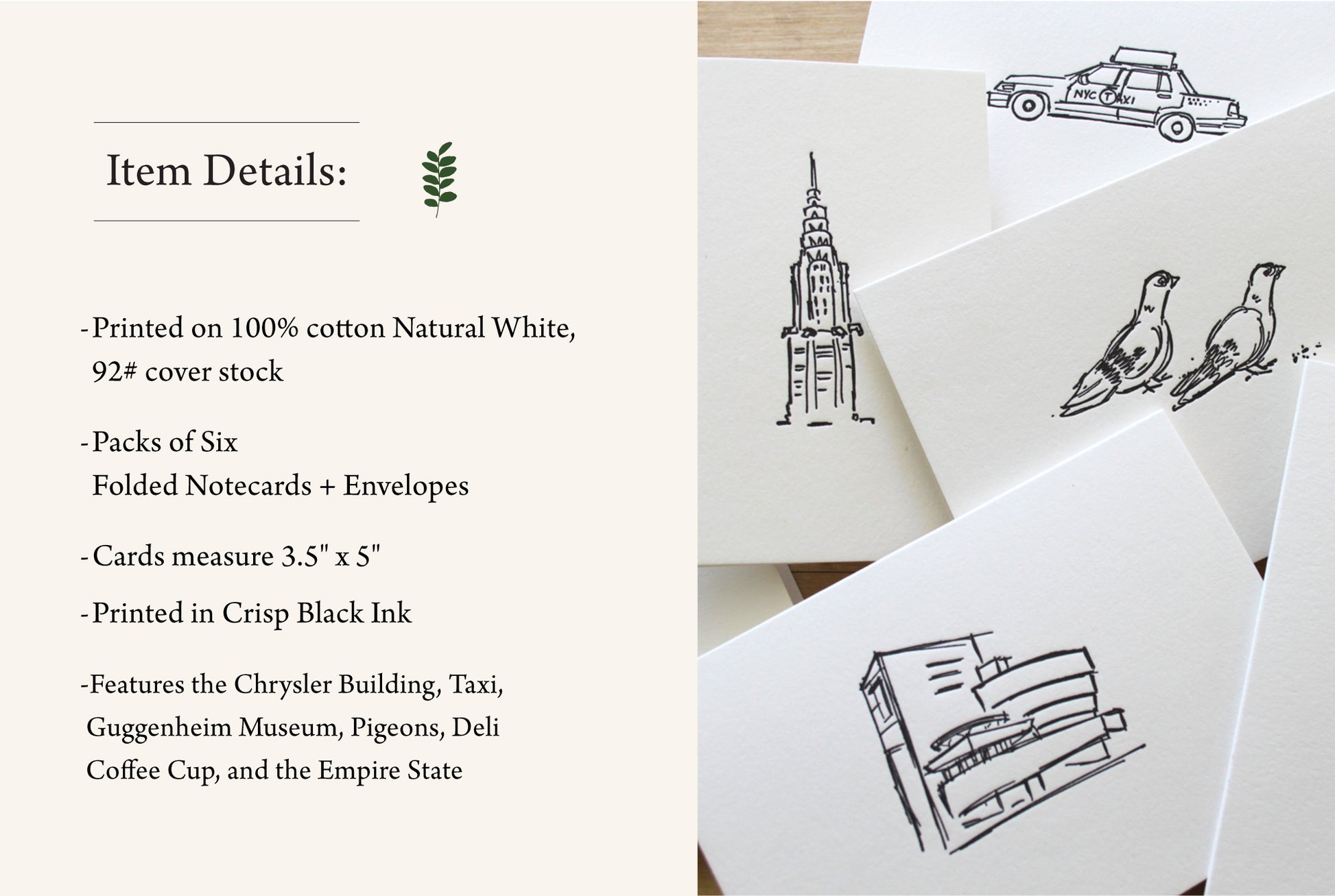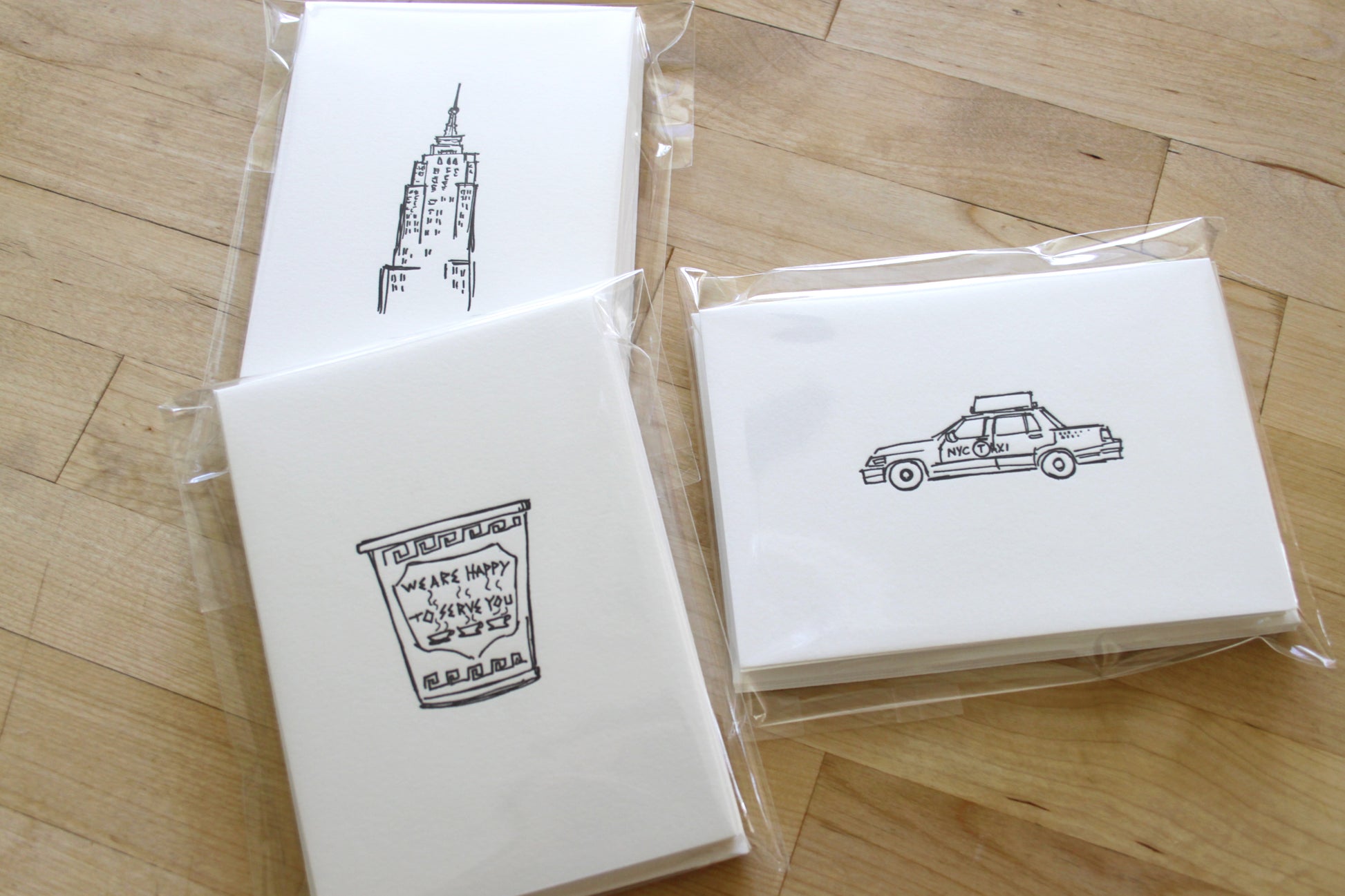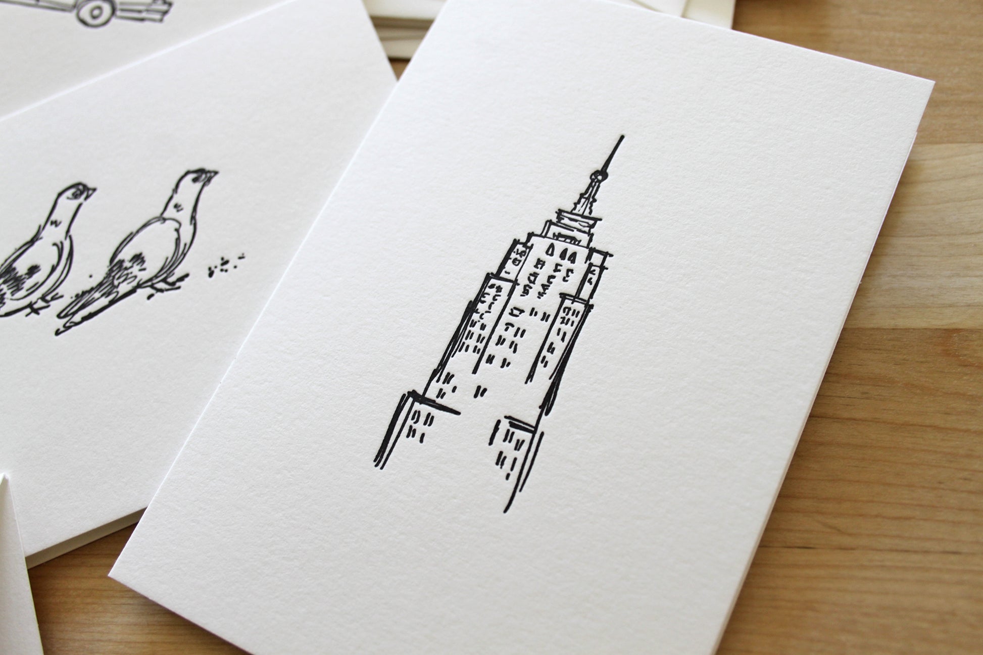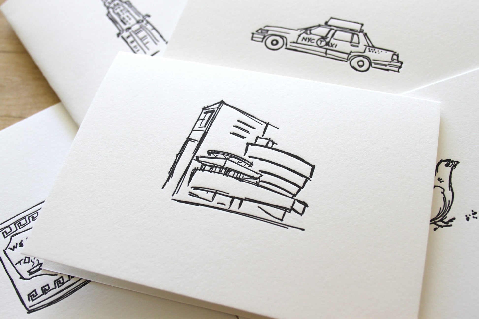 Six Letterpress FOLDED Notecards. Bring a touch of New York charm to your handwritten notes. This six-card notecard set features original illustrations by artist Matthew Nixon, printed by hand on our antique letterpress. Each design highlights the city’s most beloved icons: the Empire State Building, Chrysler Building, Guggenheim, a pair of pigeons, the classic Greek coffee cup, and the iconic NYC taxi.
