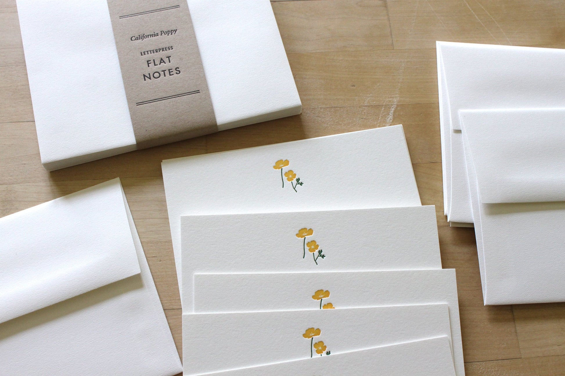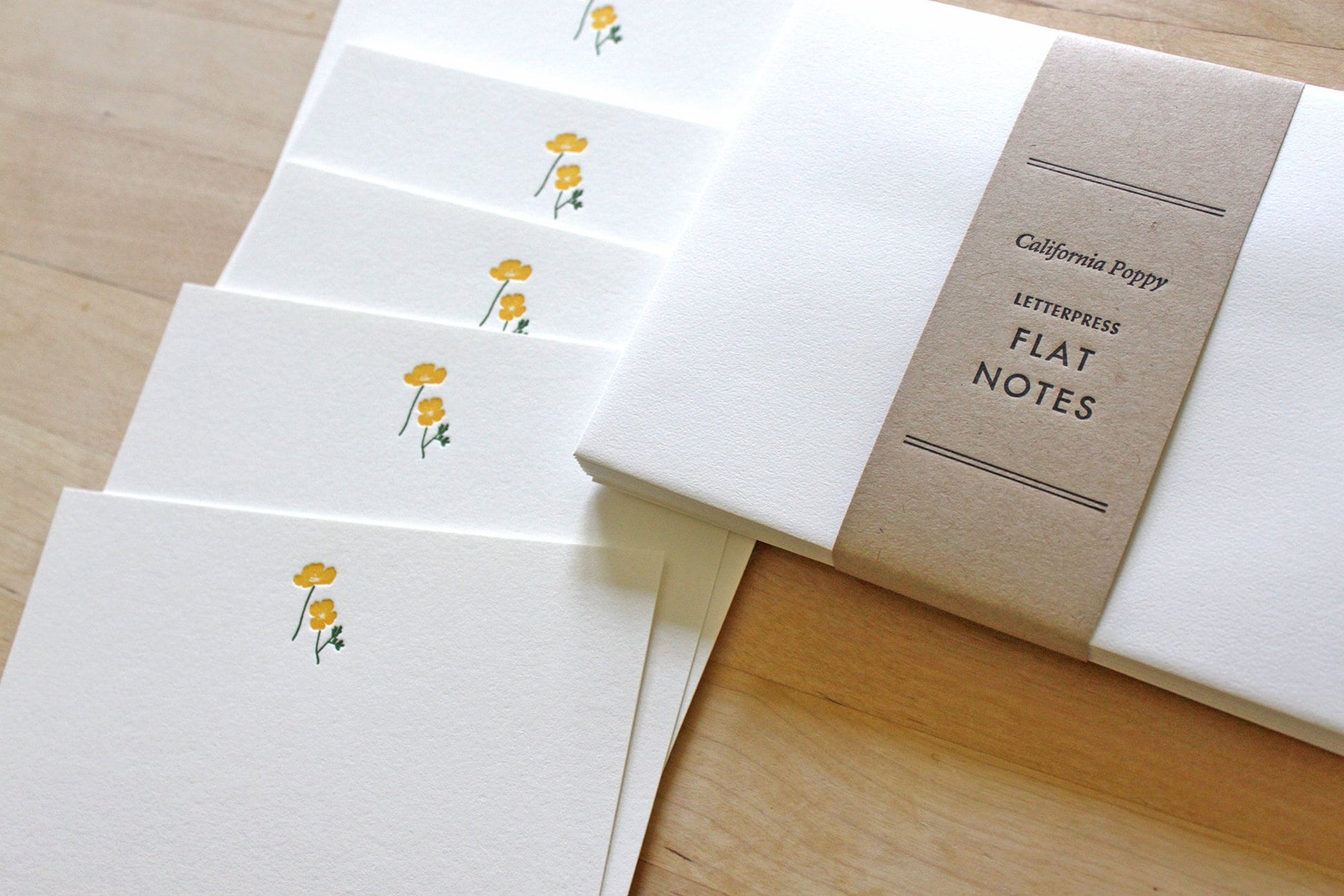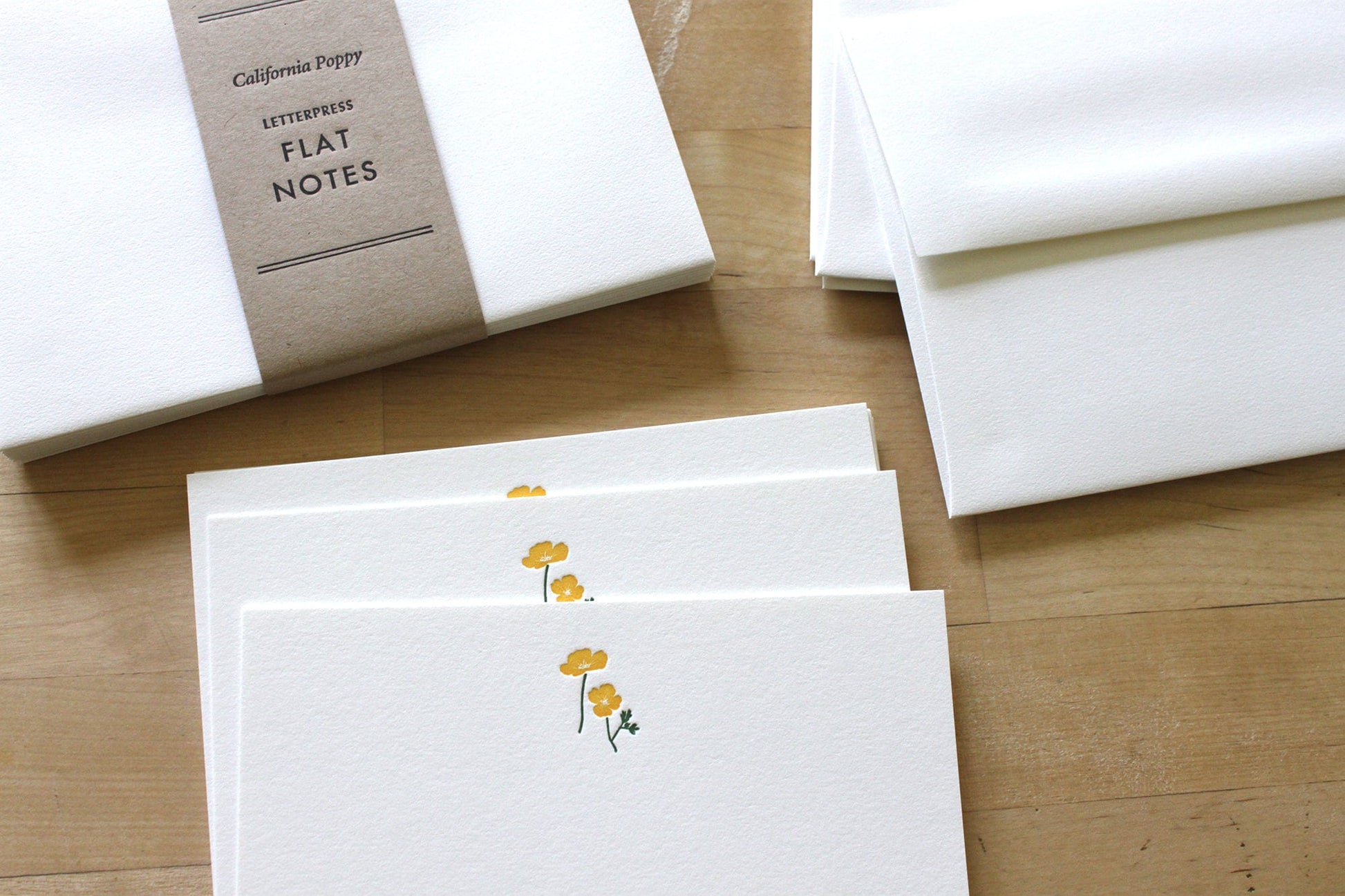 Letterpress FLAT cards with 2-color California Poppy images and matching blank envelopes. Beautiful Garden Design, these Thank You Cards or General Stationery Notes are printed on 100% recycled cotton paper and measure 5.375" x 4.125" (A2).