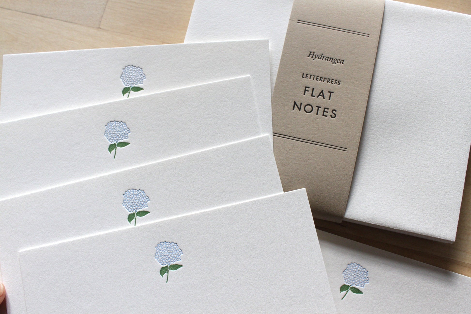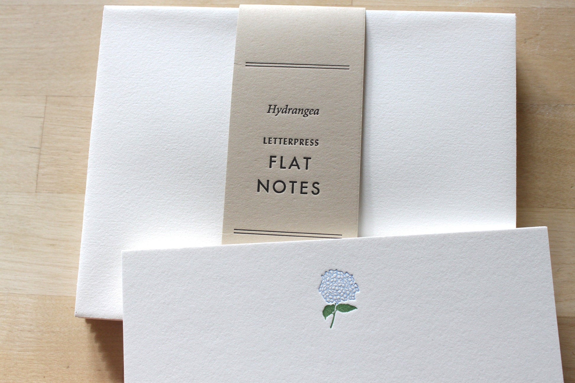 Letterpress Thank You cards with 2-color HYDRANGEA image and matching blank envelopes. Cards are printed on 100% recycled cotton paper. Cards measure 5.375" x 4.125" (A2).