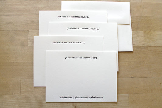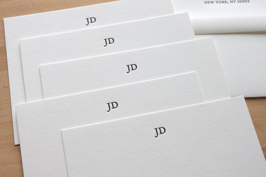 This handcrafted collection of personalized letterpress stationery by Moontree Letterpress is printed on 100% cotton paper using antique presses in Bucks County, Pennsylvania. Each set is individually hand-fed and custom printed with your name or initials, offering a timeless way to elevate correspondence or give a meaningful, lasting gift. Shop Standard and Executive notecards below.