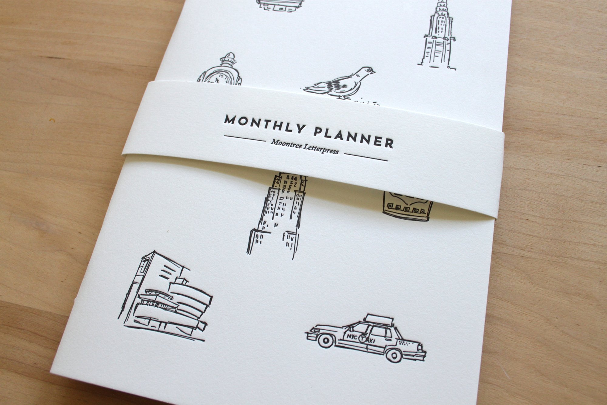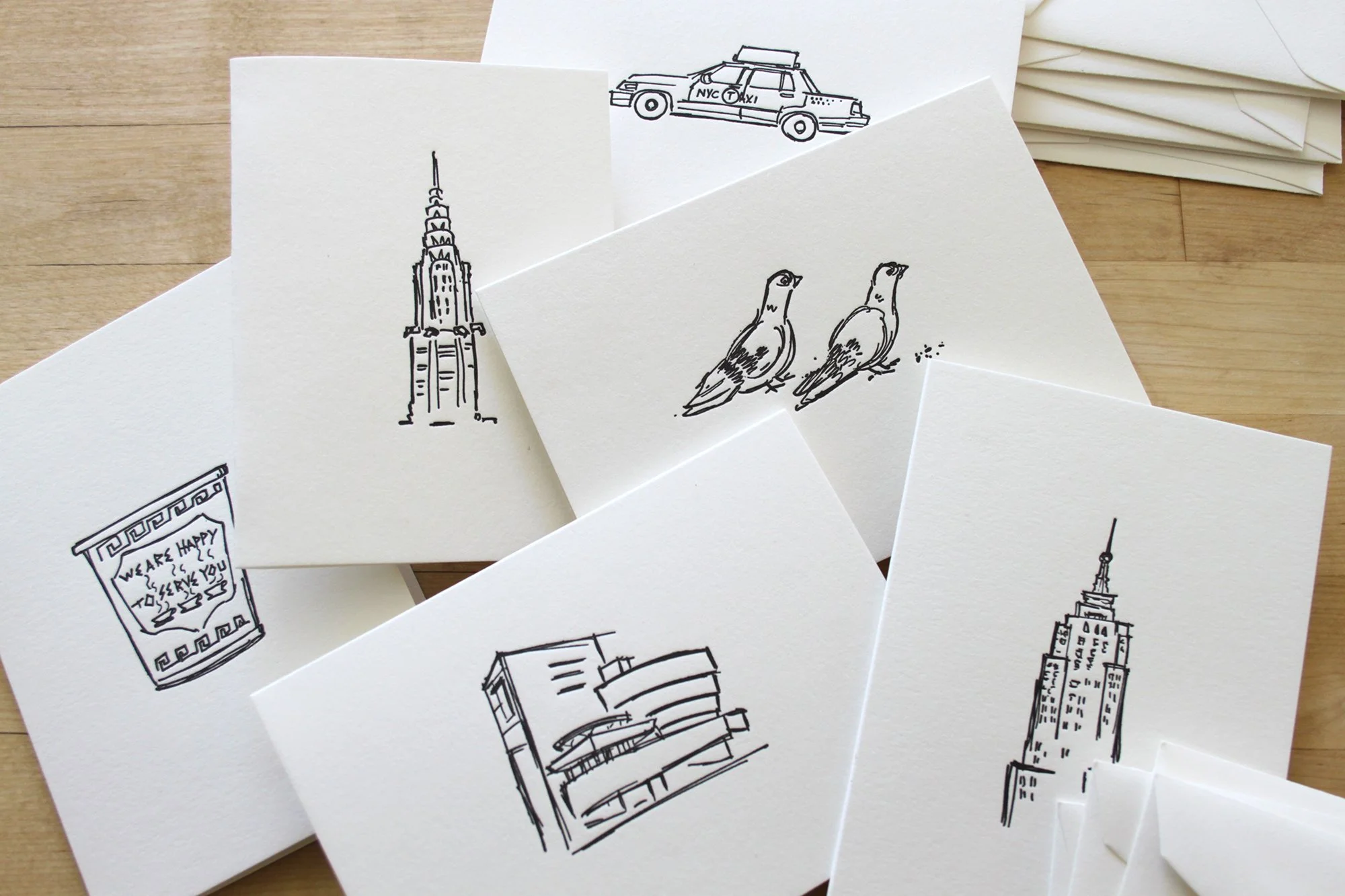 We brought Matthew’s drawings to life through letterpress, printing them on small notecards and a weekly / monthly planner. The result is a set that feels at once modern and timeless, much like New York itself. These pieces celebrate the little details that define life in the city—reminders of its energy, humor, and history—captured in crisp black ink on thick cotton paper.